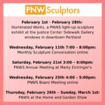 February 1st – February 28th: Illuminated Works, a PNWS light-up sculpture exhibit at the Justice Center Sidewalk Gallery windows in downtown Portland