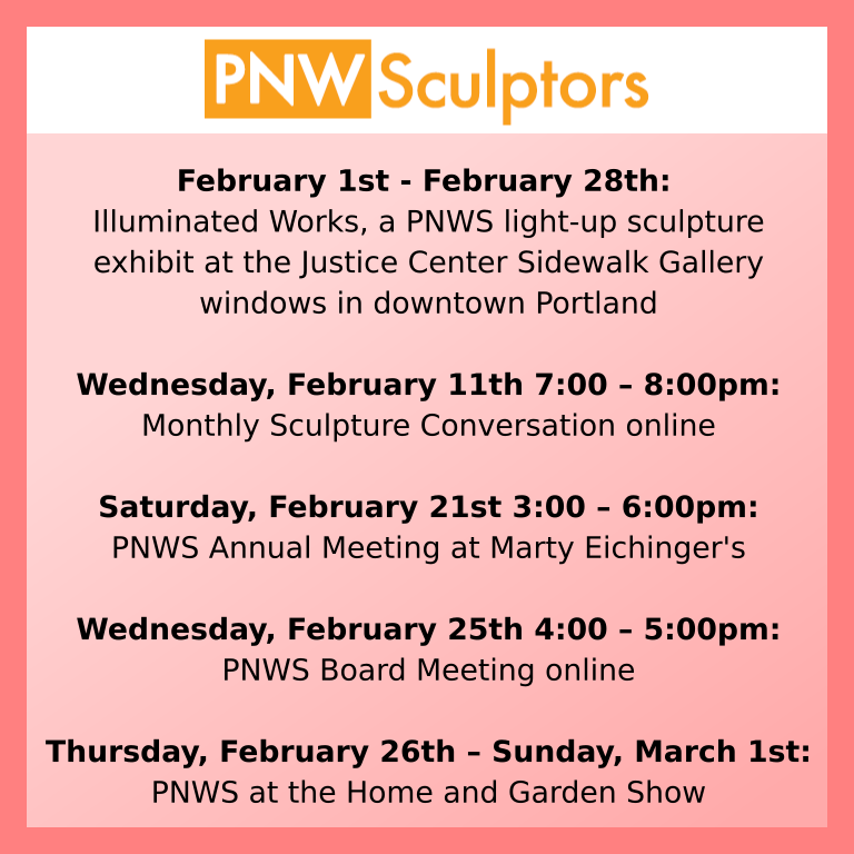 Wednesday, February 11th 7:00 – 8:00pm: Monthly Sculpture Conversation online, https://pnwsculptors.org/join-the-pnws-monthly-sculpture-conversation-2nd-wednesdays-2/